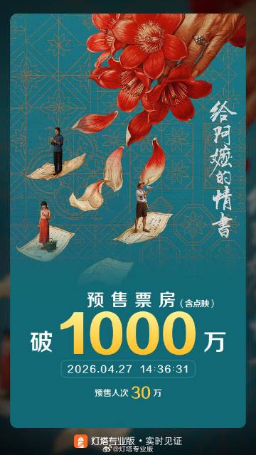 据灯塔专业版实时数据,截至4月27日14时36分,影片《给阿嬷的情书》点映及预售总票房突破1000万。