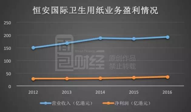 2014年至2016年,恒安国际的卫生用纸业务的营收均维持在190亿港元上下,营收增速在2016年仅为3.2%,而净利润则呈小幅上涨趋势,2016年的净利润为36亿港元,较2012年的年复合增长率仅为5.6%。
