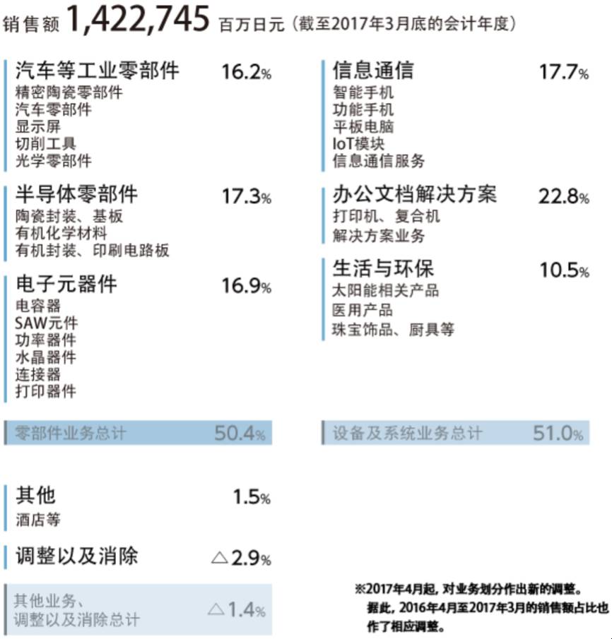 1972年,京瓷于东京证券交易所上市,而后于1980年在纽交所上市发行ADR,在1982年与另外4家公司合并,正式改名为“京瓷株式会社”,目前京瓷集团涉足众多行业,但基本上还是依托自身顶尖的陶瓷技术来发展,下图为京瓷官网上截取的各个业务情况图:
