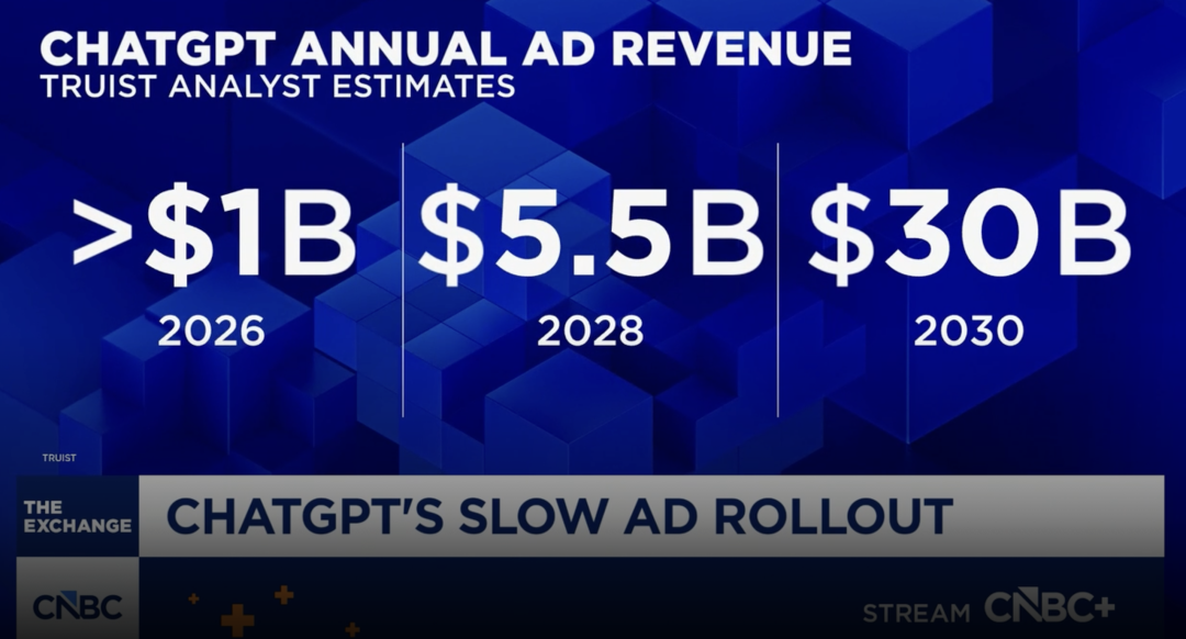 美国投行Truist预计OpenAI广告收入到2030年将增长至300亿美元以上。