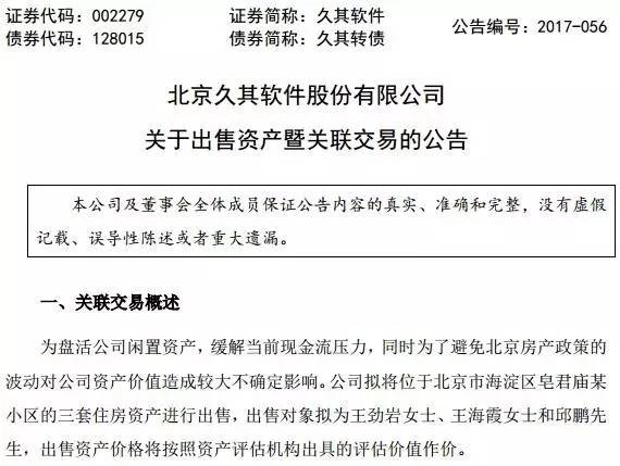对于卖房的原因,每日经济新闻记者致电久其软件董秘办,相关工作人员表示,此次交易是为盘活公司闲置资产,缓解当前现金流压力等,公告里已经做了解释。至于为什么要卖给关联方,一方面,关联方有买房需求,这房子也是学区房;另一方面,从上市公司角度考虑,交易方的履约能力要比较强。