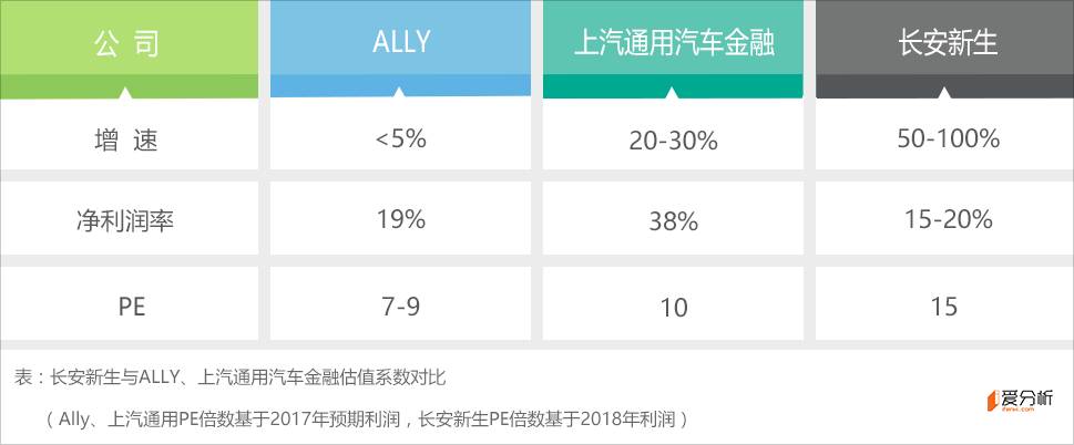 在长安新生估值模型中,我们选择ALLY和上汽通用金融作为对标,由于ALLY 2017年预期增速在5%以下,给予7-9倍PE;上汽通用金融增速在20-30%,给予10倍PE。