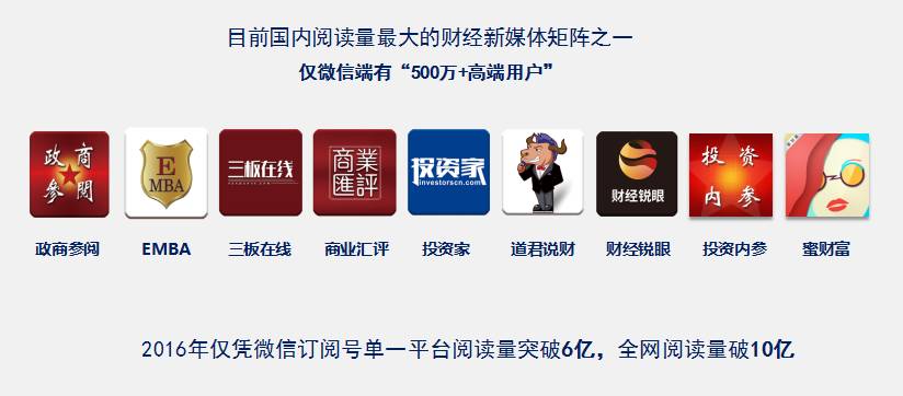 作为国内流量最大的财经新媒体矩阵,拥有凝聚500多万高端精英受众,其所承载的社群运营想象空间是难以估量的。旗下最大的三个最大的号:政商参阅、EMBA、投资家分别代表了政府、企业家、投资人三类人群,而在三类人群不仅是社会上最有影响力的人群,又是互相不可或缺与需要合作共赢的三类人群。而他自己,也在去年就读了对外经济贸易大学国际商学院的EMBA,成为了当时学院最年轻的的EMBA学员之一。