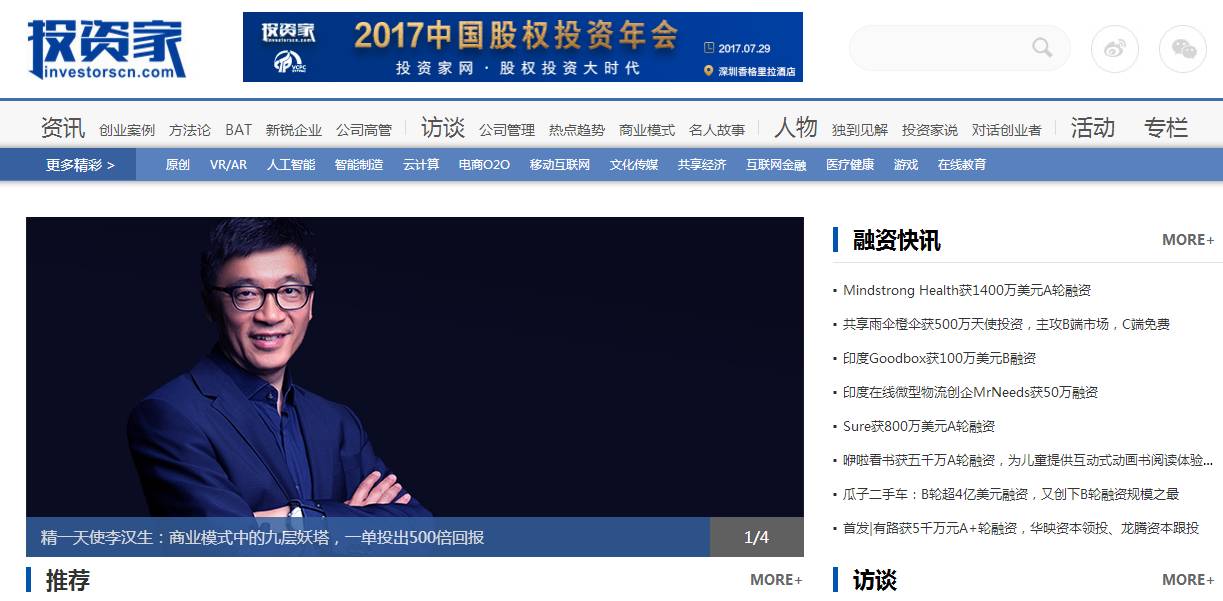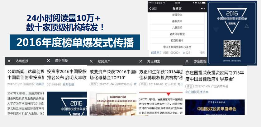 同时,16年在创投圈掀起一股旋风,深度报道获得广泛好评,网站浏览量直冲行业前三,雨后春笋般与各地方政府举办投资论坛及引导基金合作,举办创投行业最盛大专业的年度峰会,颁布广受投资行业认可与关注的中国股权投资年度榜单的投资家网(www.investorscn.com)也是他的杰作。