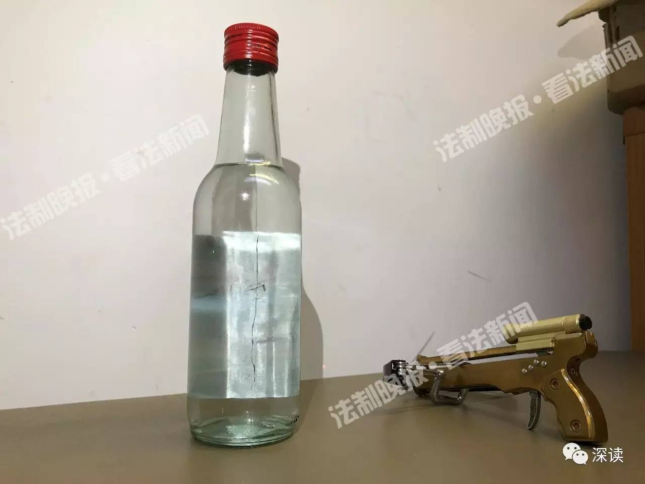 “啪!”,钢珠弹击中酒瓶后,又反弹回来。此时,白酒瓶瓶体被击出一个雪花状痕迹,同时有一条约7厘米左右长的裂缝,酒已经渗出来。在射击易拉罐时,罐体被钢珠打出了6平方厘米的凹痕,凹痕中间钢珠留下白点清晰可见。