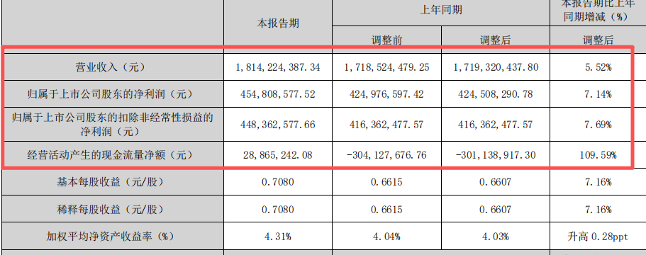 一季报显示,东阿阿胶实现营业收入18.14亿元,同比增长5.52%;归属于上市公司股东的净利润4.55亿元,同比增长7.14%;归属于上市公司股东的扣除非经常性损益的净利润4.48亿元,同比增长7.69%。