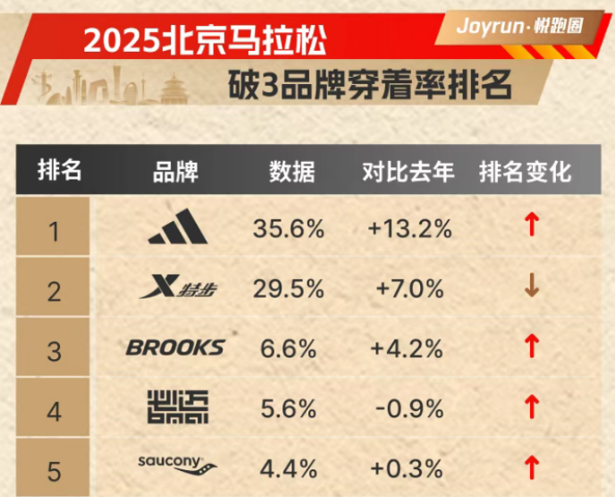 据悦跑数据研究院统计数据,2025年北京马拉松破三选手的上脚率前三为阿迪达斯(35.6%)、特步(29.5%)和布鲁克斯(6.6%);全局选手品牌穿着率排行榜前三分别为特步(32.8%)、阿迪达斯(18%)和索康尼(11.7%)。