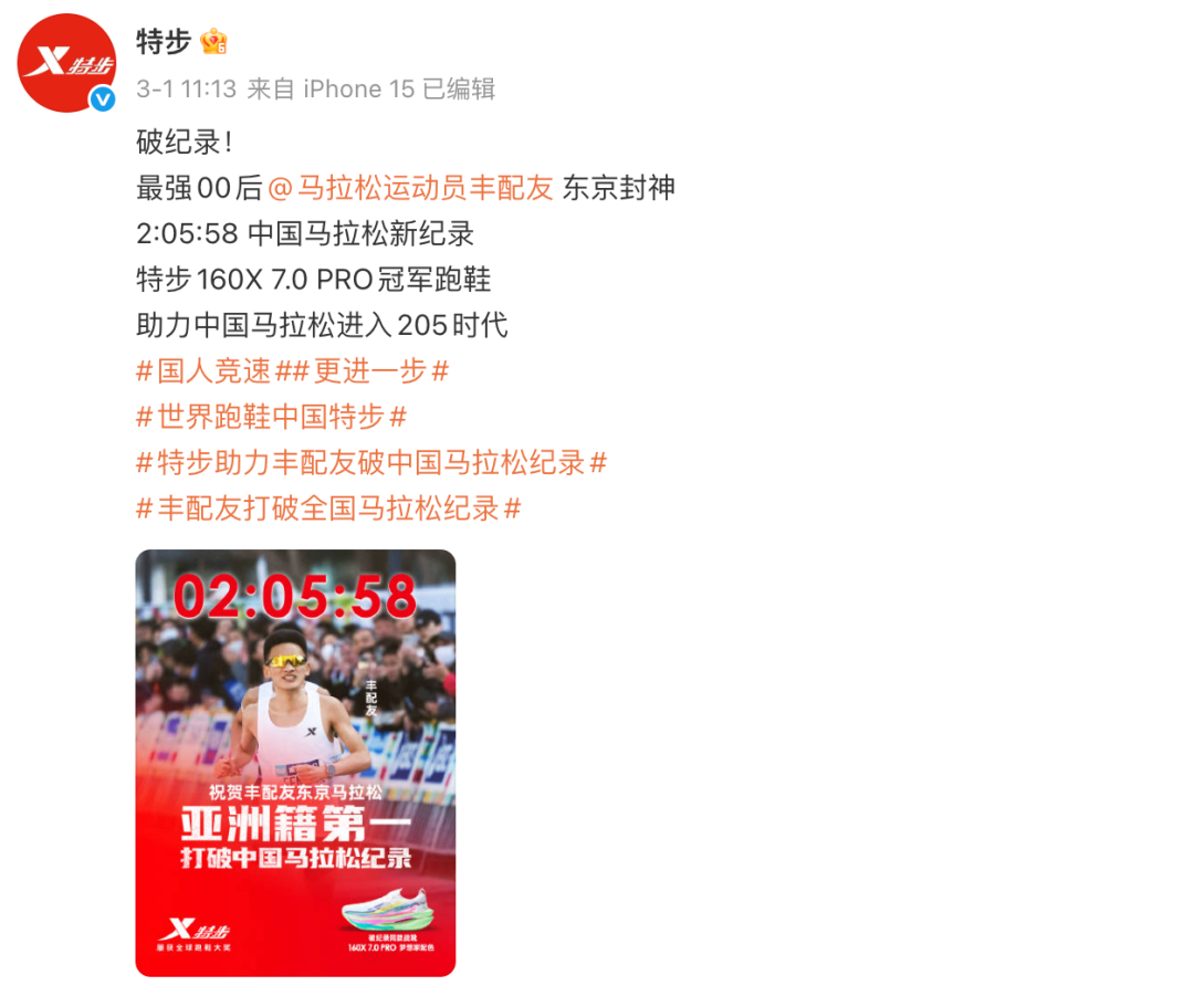 3月初,特步签约运动员丰配友在东京马拉松以2小时05分58秒的成绩夺得亚洲第一,标志着中国马拉松正式进入“205时代”。