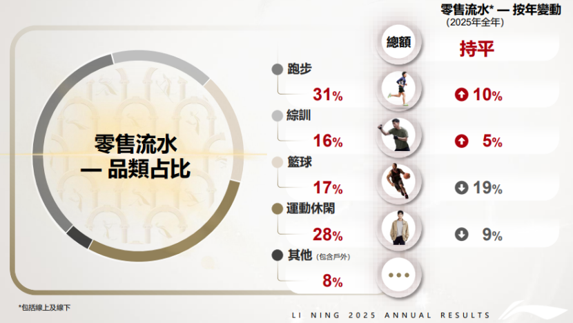 但也需要看到,李宁以往的优势类目,例如篮球、运动休闲品类,在该项运动陷入行业调整期、国际品牌涌入赛道竞争加剧时,零售流水随之较大幅波动,年度流水分别下滑19%、9%。