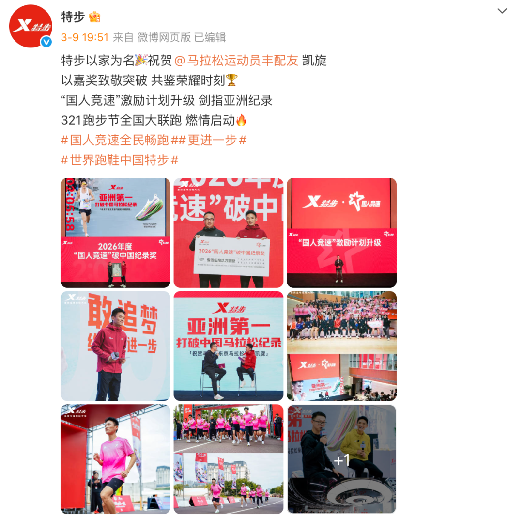 2019年,特步就与中国田径协会(CAA)共同发起“国人竞速”激励计划,设置破纪录奖(破全国纪录奖励100万元,每突破1秒额外奖励1万元)激励马拉松运动员;今年3月12日,基础奖金升级为破亚洲纪录奖励300万元。