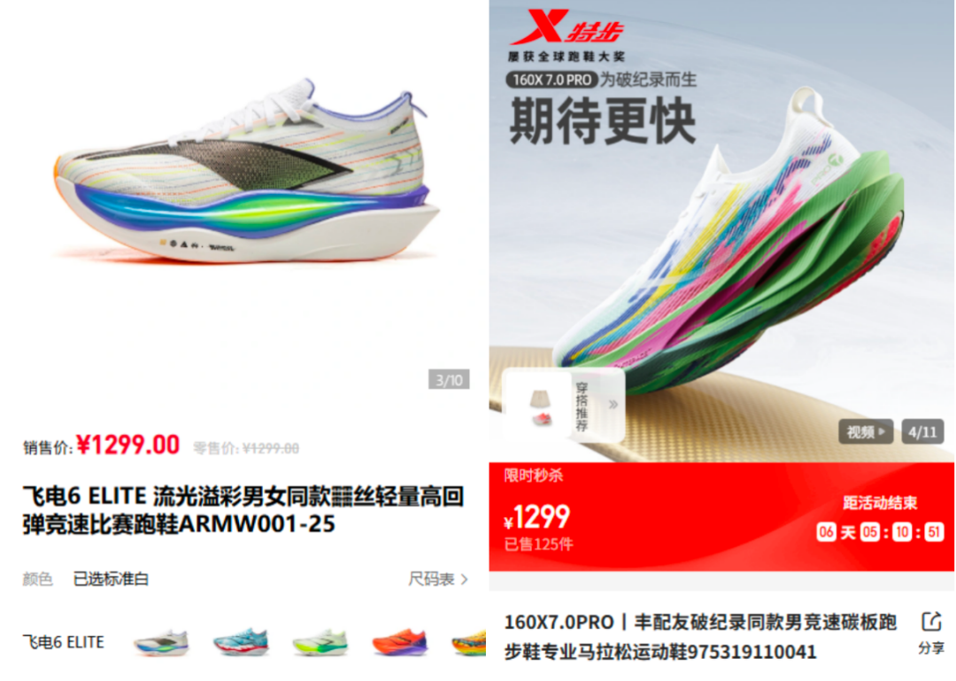 产品方面,2025年,李宁飞电 5 ELITE成为各大领奖台常客;2025年底,接力的飞电 6 ELITE亮相。有意思的是,助力王文杰破纪录的李宁飞电 6 ELITE,与助力丰配友破纪录的特步160X 7.0 PRO,官方定价都在1299元/双。