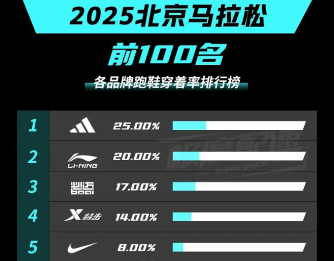 在耐克赞助的2025年上海马拉松上,据悦跑数据研究院的统计,全局跑者上脚率前三名分别是特步(21.5%)、耐克(14%)、阿迪达斯(12%);破三跑者上脚率前五名分别为李宁(22.2%)、布鲁克斯(15.8%)、耐克(15.3%)、特步(12.2%)、阿迪达斯(8.5%)。