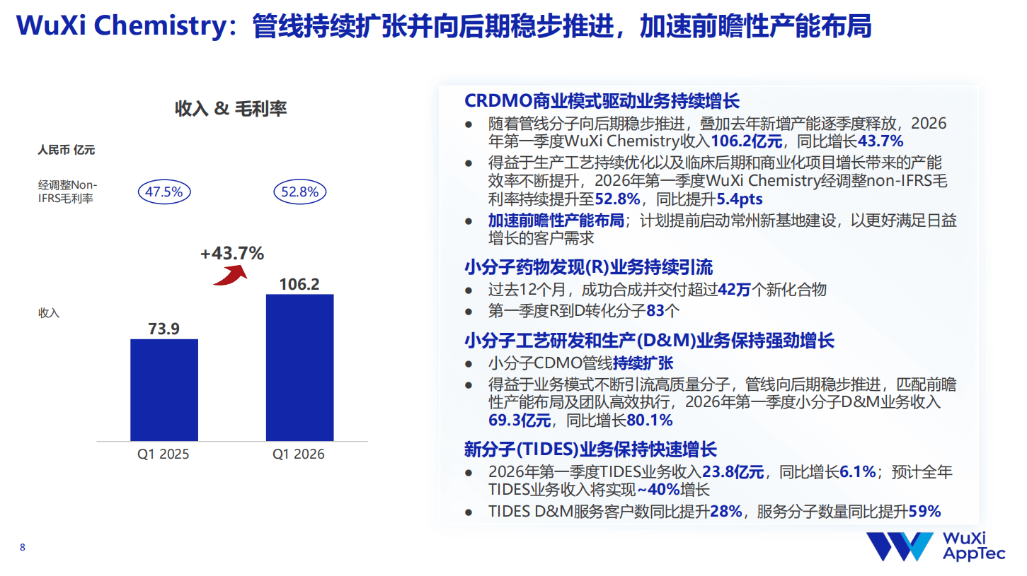 公司对TIDES业务全年收入增长约40%的信心,源于持续增长的市场需求。数据显示,2025年该业务收入已达113.7亿元,同比大增96.0%。截至一季度末,TIDES D&M服务客户数与服务分子数量分别同比提升28%和59%,项目储备极为丰富。持续扩充的产能,将直接驱动该业务向新的百亿里程碑迈进。