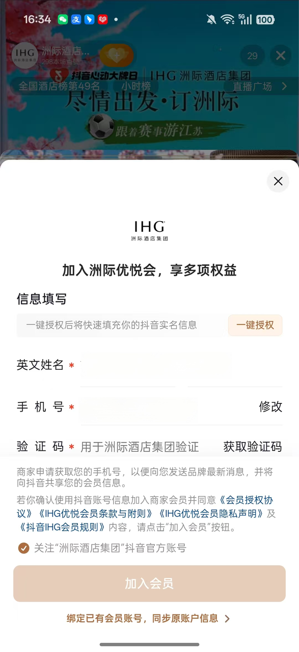 图:洲际集团抖音会员授权页面,
