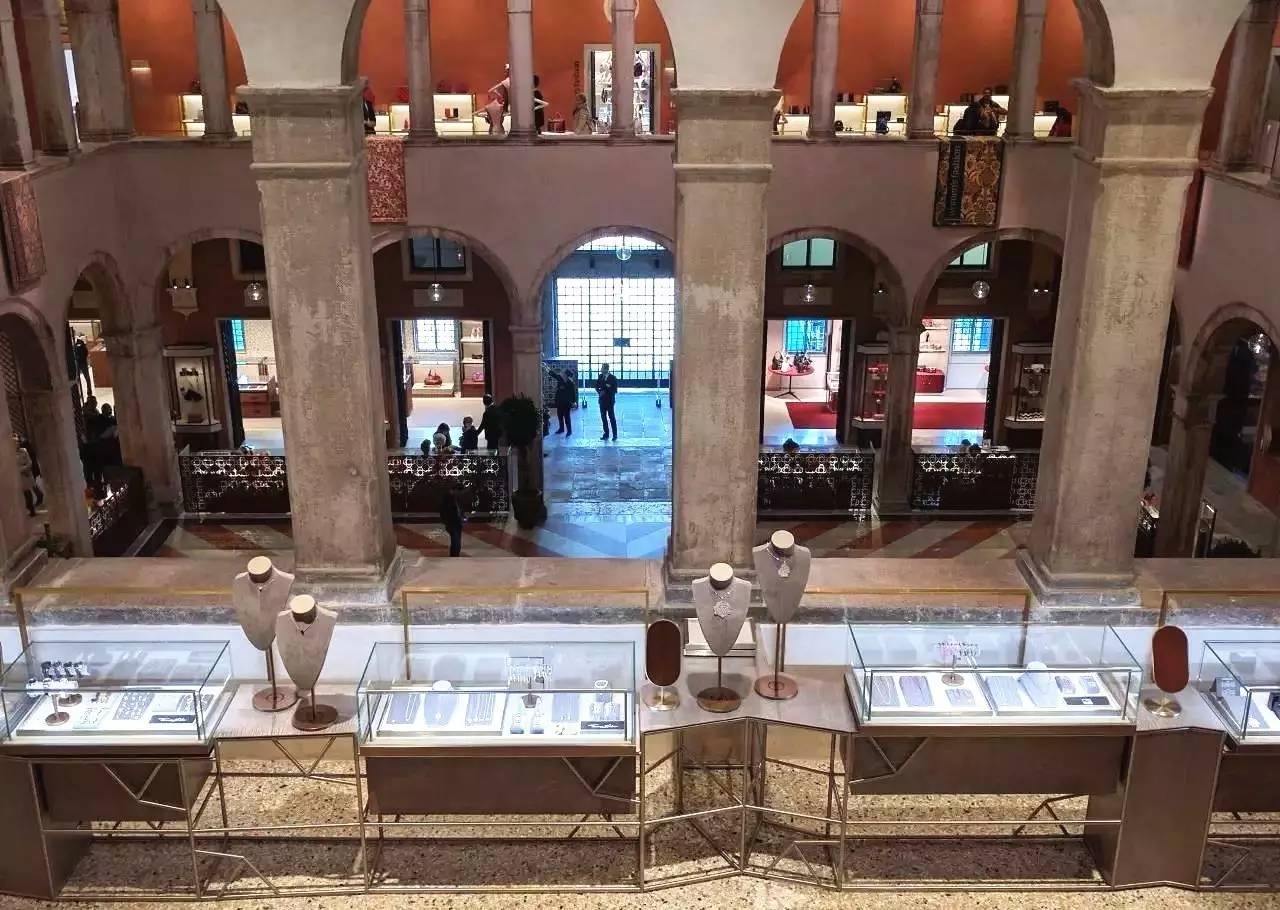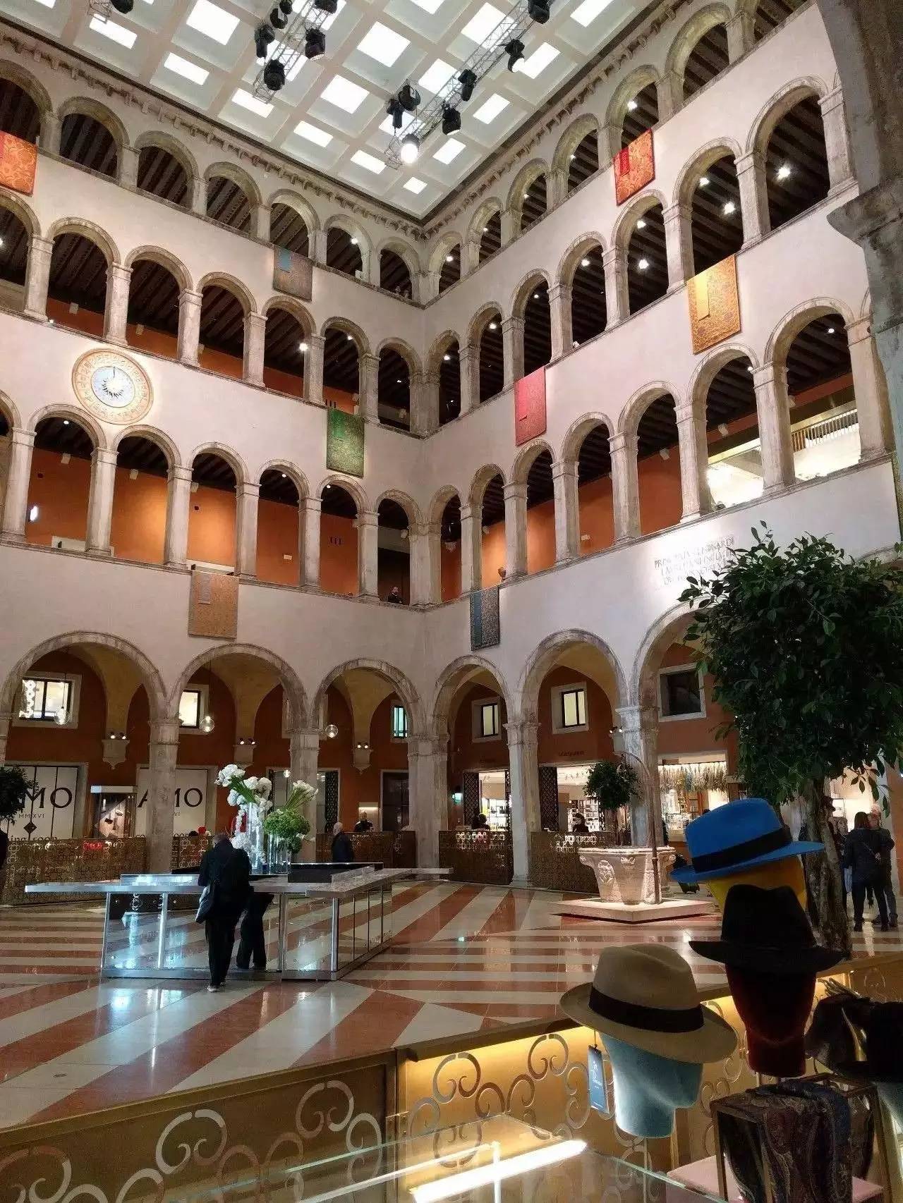 走进四四方方的中庭,我怎么感觉不像进入了商场,而更像一座剧院。这里一共五层,方正的中庭边环绕着一圈商店。每一层的每一面都有很多拱门面朝中庭。在寸土寸金的威尼斯能找到一座大楼建商场,还把中间宽阔的中庭空了出来,也只有将奢华植入DNA的LVMH集团才能做出来吧。