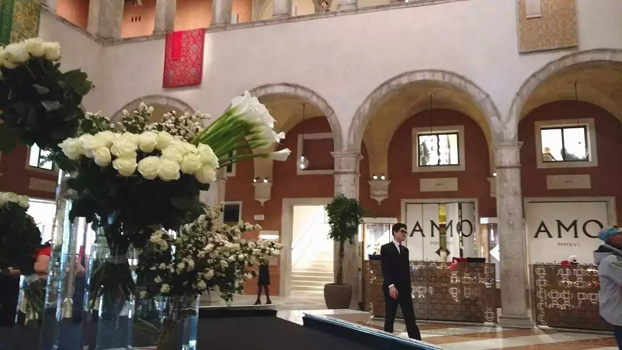 从外边看来,一幢白色的方正大楼在众多妖艳华丽的威尼斯建筑里面显得低调。一位身着黑色西装的典型意大利帅哥为我们拉开玻璃门,略显空旷的大厅一层在我们面前展开。展现在我们面前的除了正中间的鲜花,还有一座中世纪的古水井,同时,空气中弥漫着一股不浓不烈特别好闻的东方风情香味,让我忍不住深嗅了几下。