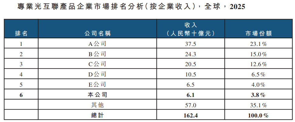 行业越有前景,竞争就越激烈。界面新闻获悉,2025年,全球主要对外生产光互联产品的前六大供货商合计市场份额约64.9%。其中,华工科技以光互联业务营收61亿元排名第六,市场占有率3.8%,中际旭创、新易盛等前五名公司的市场份额分别是23.1%、15%、12.6%、6.5%、4%。