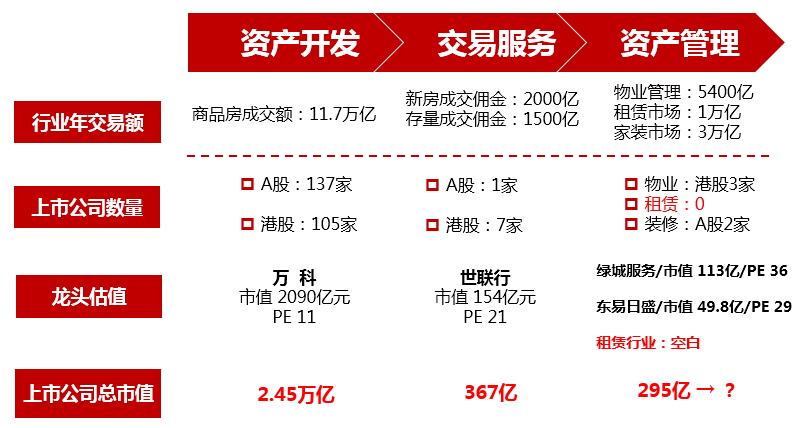 传统的房地产业务阶段上大致可以分为开发、交易、资产管理三个环节。按目前的市场空间估算,整体房地产服务市场空间在5.3万亿左右,这一个万亿市场中目前为止仍未成长出一个千亿市值的公司,A股市场中唯一的地产服务类公司世联行市值只有160亿左右,可见行业投资价值仍未得到充分挖掘,而身处其中的企业业务收入和市场集中度仍有很大的提升空间。资产管理市场整体仍是一座尚待发掘的金矿。