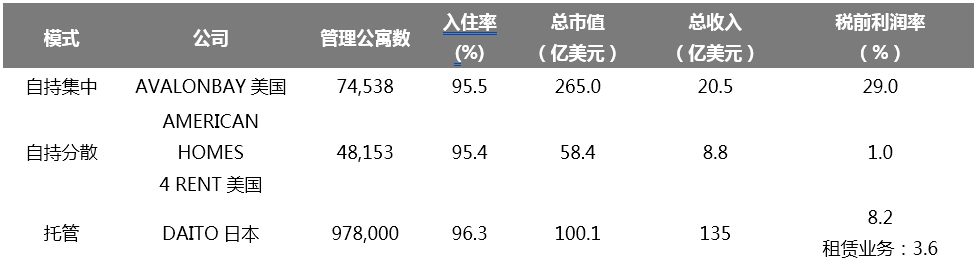 纵观美国和日本的长租公寓市场,我们发现有三种代表型的上市公司:自持集中型、自持分散型、托管型。前两种出现在美国市场,市值最大的两家公司为AVALONBAY(AVB)和AMERICAN HOMES 4 RENT(AMH);最后一种出现在日本市场,市值最大的是大东建托(DAITO)。其中盈利能力最好的是自持集中式的AVB,税前利润率为29%,其次是托管式的大东建托,纯租赁业务的税前利润率为3.6%。自持分散式的AMH只有1%。