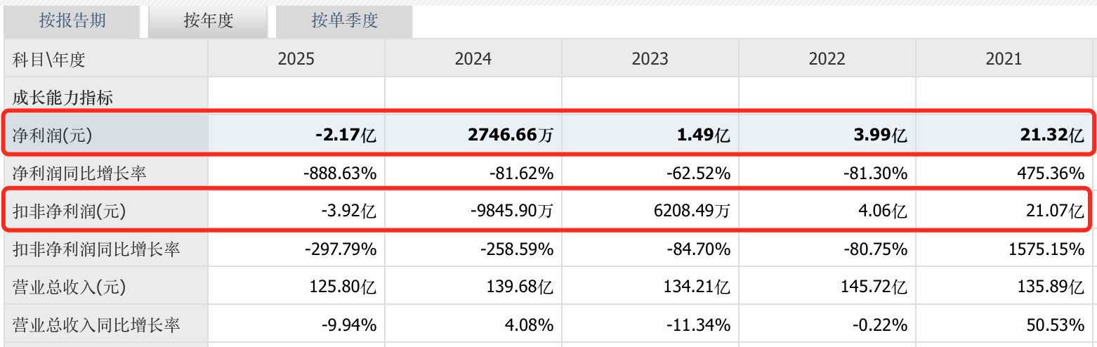 2021年至2025年,神马股份的营业收入分别为135.89亿元、145.72亿元、134.21亿元、139.68亿元、125.8亿元。但净利润2021年创下21.32亿元归母净利润峰值后,持续滑坡,2025年甚至巨亏2.17亿元。