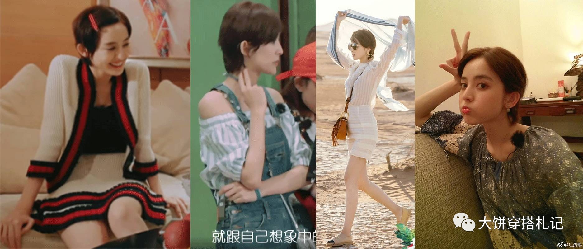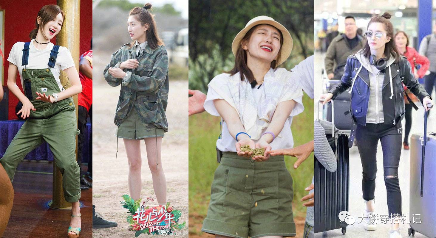咱们首先来看看社会我江姐:江疏影。纵观全程,你会发现她的衣橱里迷彩、皮衣、军绿这种硬朗的单品偏多,款式上也以轻便、随意的背带裤、短裤、铅笔裤为主。