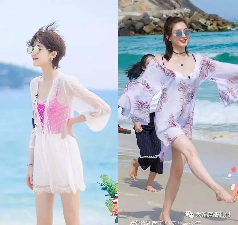 娜扎在连体泳衣外搭Zimmermann蕾丝罩衫和短裙,甜美又小露性感,只是泳衣颜色有些过于艳丽,挑人穿;