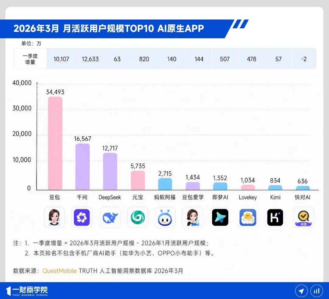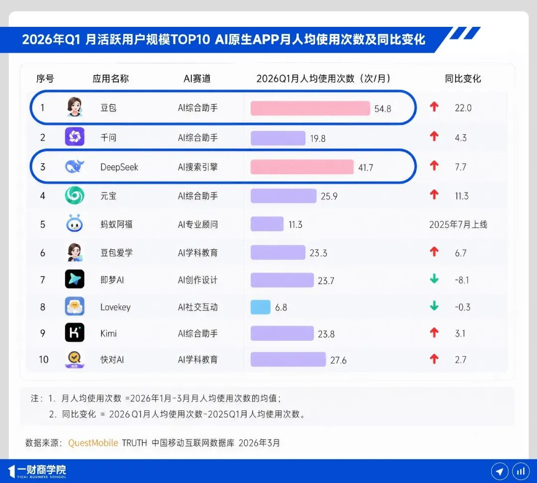 Quest Mobile 2026 年一季度报告显示,中国AI原生APP月活用户已经达到 4.4 亿。其中,豆包月活3.45亿,千问1.66亿,DeepSeek1.27亿;豆包月人均使用次数达到 54.8 次,DeepSeek 也达到41.7 次。