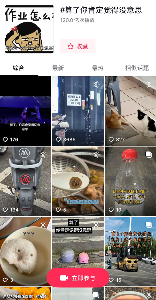 事实上,类似「算了你一定觉得没意思」这样的梗,短视频上每个月都会刷新很多。它不会改变人生,但在你疲惫时,它确实构成了一种即时印象,像大脑缓存里的数据碎片——它们太小了,小到不会专门腾出内存去记,但它们恰好能在你加载了过量工作信息的间隙里,让你短暂地回到一种能细腻体会细小快乐的状态。喘口气,然后缓存被清掉,下周再换下一批。