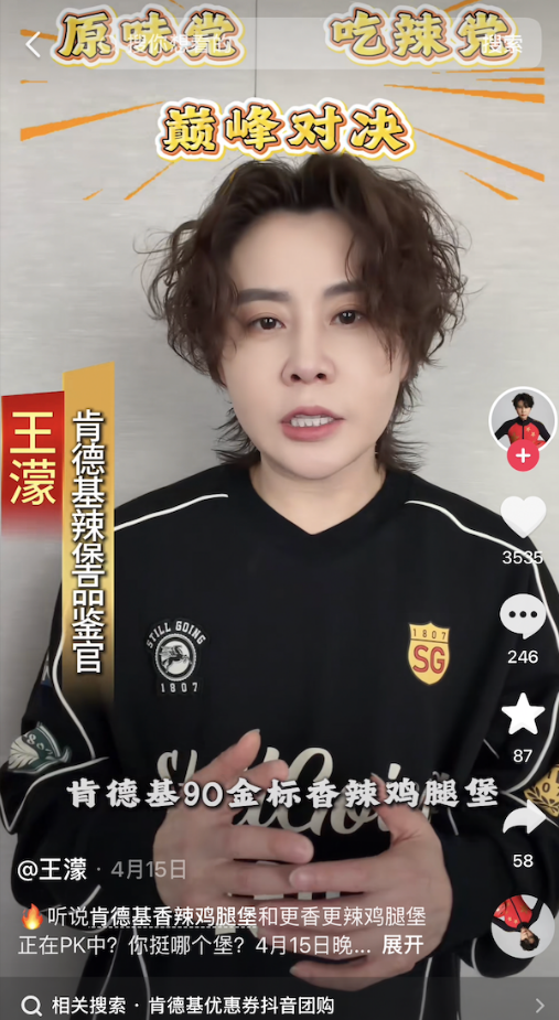 类似的逻辑也适用于达人热点承接。和麦当龙那种依赖用户自发造梗、可遇不可求的路子不同,品牌还有另一条更顺手的路径:直接借势已经有热度的人和内容,主动搭建承接链路。以KFC为例,看准近期《浪姐》热度,迅速合作了短道速滑冠军王濛做直播团购带货。