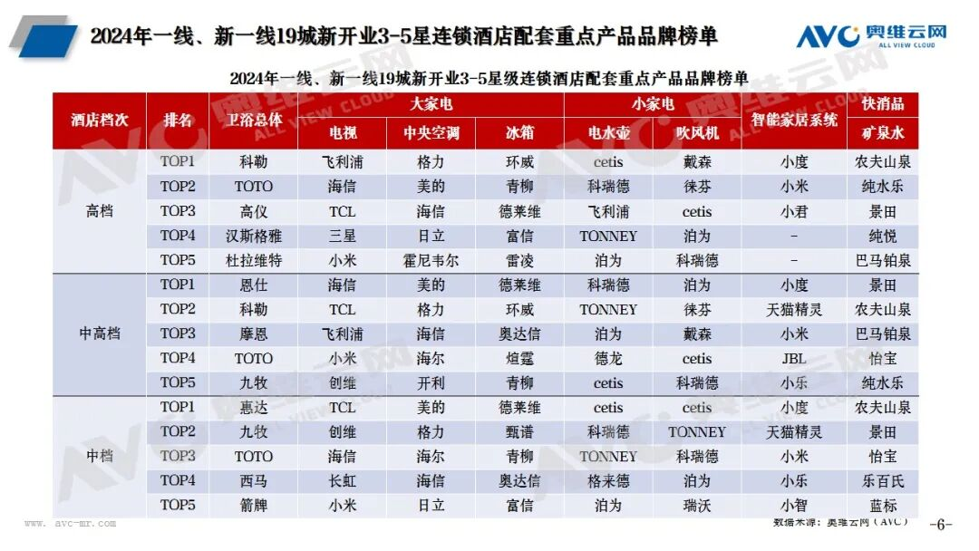 奥维云网数据显示,从2024年一线、新一线19城3-5星级连锁酒店新开业项目配套总体卫浴市场来看,除订制外TOP5品牌市场份额合计40.5%,其中科勒、TOTO遥遥领先。