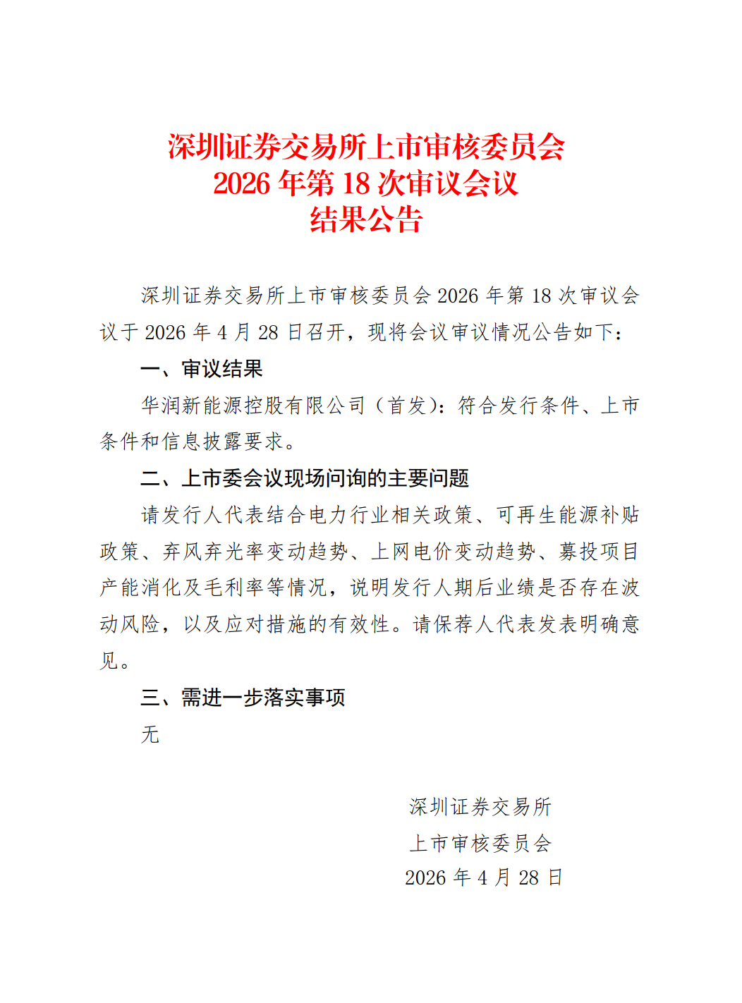 4月28日,深交所上市审核委员会2026年第18次审议会议结果公布,华润新能源控股有限公司(下称华润新能源)首发申请正式获通过。