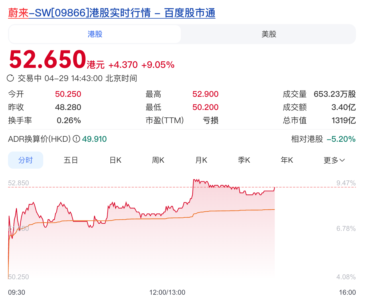 4月29日,港股新能源汽车板块走高,蔚来-SW(09866.HK)涨超9%领衔,比亚迪股份(01211.HK)、理想汽车-W(02015.HK)、小鹏集团-W(09868.HK)等跟涨。截至发稿,蔚来涨9.05%,报52.65港元/股,最新市值1319亿港元。