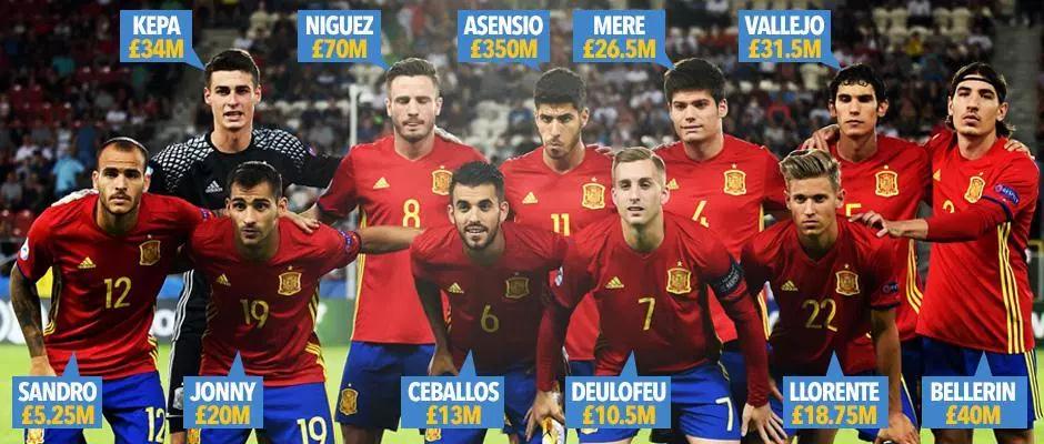 本届U21欧青赛,西班牙可谓众星云集,除了后卫格里马尔多效力于葡超冠军本菲卡之外,其余队员全部效力于五大联赛。甚至在小组赛在首场迎战马其顿的首发阵容中,只有三名球员与西超三强皇家马德里、巴塞罗那和马德里竞技无关。根据英国《太阳报》的统计,在计算违约金的情况下,这支球队的身价总额将达到惊人的6.2亿英镑。