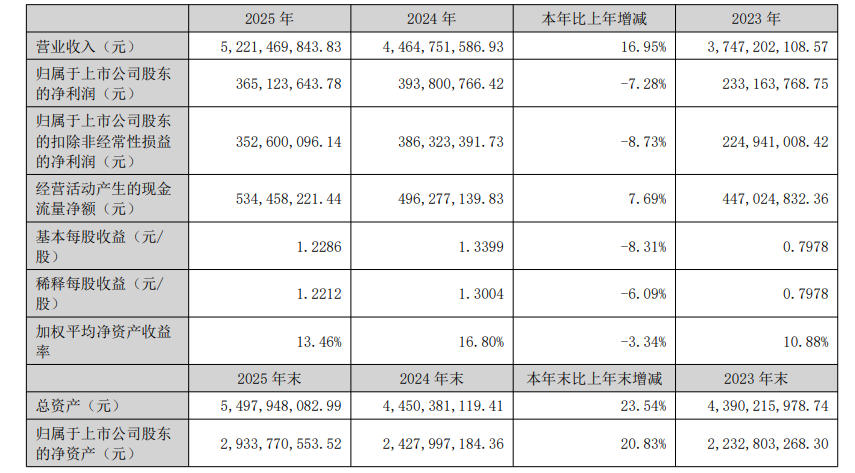 报告显示,2025年中宠股份全年实现营业收入52.21亿元,同比增长16.95%;但归母净利润为3.65亿元,同比下降7.28%;扣非后归母净利润3.53亿元,同比下降8.73%。