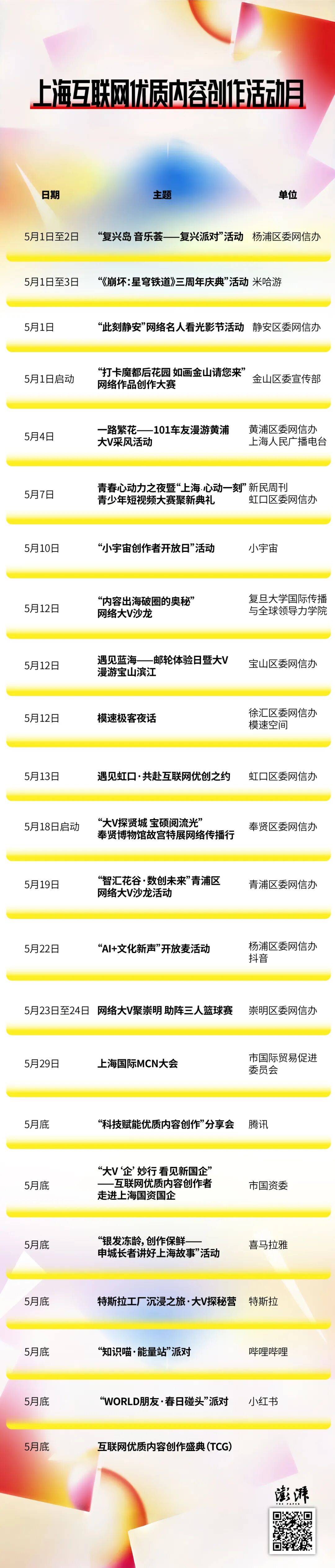 周周有活动,全城皆场景。“活动月”期间20余场线下活动将在黄浦、静安、徐汇、虹口、杨浦、宝山、金山、青浦、奉贤、崇明等区密集开展,从复兴岛音乐荟的青春派对到赛事特展的现场品鉴,从特斯拉超级工厂的制造探秘到夜话科创AI,覆盖Z世代创意、城市叙事、知识科普、生活美学等垂类领域。活动既有面向创作者的潮流聚会,也有定向邀约的沙龙研讨;既有深入各类企业的探访,也有走进里弄街巷的体验。为互联网优质内容创作者提供深度观察、记录与解读当今中国发展的新切入点,更好为正能量澎湃大流量、大流量反哺正能量创造条件。
