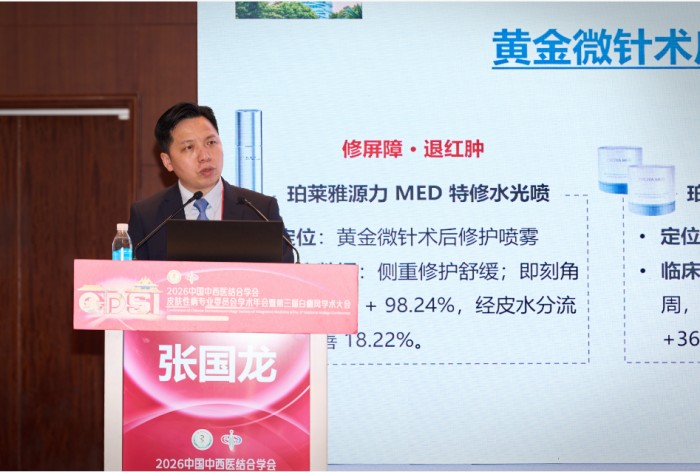 由中山大学附属第三医院赖维教授和中国医学科学院皮肤病医院杨雪源教授主持的专题会上,上海市皮肤病医院张国龙教授围绕《面部衰老黄金微针术后修复策略的探索与价值》进行分享,结合临床观察与量化测试结果,系统介绍了黄金微针术后在退红舒缓、屏障修护及防晒、防反黑等方面的修护思路。其中,珀莱雅源力MED特修水光喷、源力MED特修水光次抛、轻享阳光舒护物理防晒霜等产品,围绕术后场景开展了针对性验证,为皮肤术后护理提供了更具实证基础的解决路径。相关研究显示,上述产品在角质层含水量、经皮水分流失、红斑指数、血红素含量等指标上,均取得了较为清晰的量化结果。