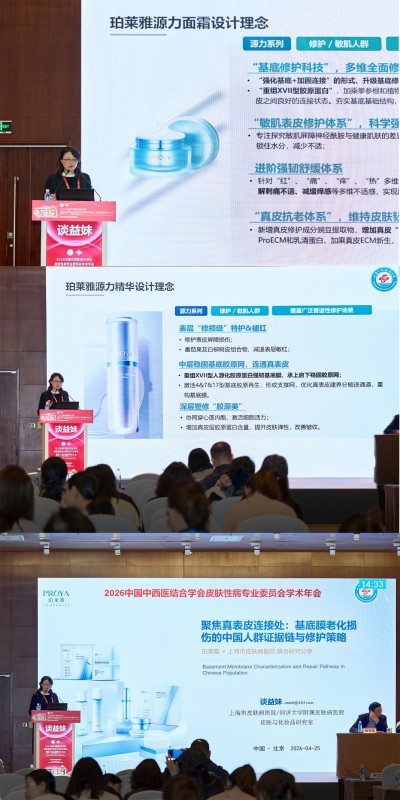 上海市皮肤病医院皮肤与化妆品研究室主任谈益妹则分享了《聚焦真表皮连接处:基底膜老化损伤的中国人群证据链与修护策略》。该研究围绕真表皮连接处及基底膜这一皮肤老化关键界面,针对中国人群开展了系统性研究,通过无创影像学、组织学验证及功能指标评估,构建起较为完整的证据链条。在此基础上,研究进一步展示了珀莱雅源力精华、源力面霜在DEJ/BM相关指标上的验证数据,为功效护肤研究机理探索、可量化证据、应用转化提供了新的研究样本。
