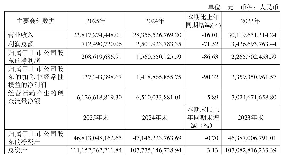2025年,公司实现营业收入238.17亿元,同比下降16.01%,归母净利润2.09亿元,同比大幅下降86.63%,扣非归母净利润降幅更高,达90.32%,显示主营业务盈利能力明显弱化。尽管利润端承压,但公司经营活动产生的现金流量净额仍保持在60亿元以上,仅小幅下降,体现出煤电主业在现金创造方面的稳定性。从季度表现看,公司全年盈利逐季走弱,尤其四季度归母净利润显著下滑,进一步反映出行业景气下行对业绩的持续影响。