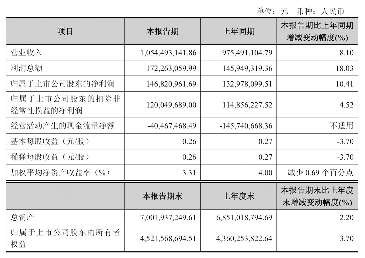 报告期内,公司实现营业收入10.54亿元,同比增长8.10%,归母净利润1.47亿元,同比增长10.41%,扣非归母净利润为1.20亿元,同比增长4.52%。从增速对比来看,归母净利润增速高于收入,但扣非归母净利润增速明显放缓,显示利润增长中存在一定非经常性因素贡献。同时,公司利润总额同比增长18.03%,整体盈利能力保持上行趋势,但加权平均净资产收益率由4.00%下降至3.31%,表明资本使用效率有所回落。