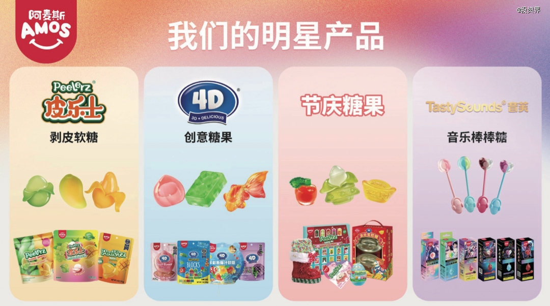 2021年,马恩多提出公司进入“全面拓展期”。阿麦斯通过专注于品类的产品创新,为传统糖果格局注入了新活力,旗下多个糖果品牌爆款频出,例如推出的“网红创意糖果”Amos阿麦斯音乐糖、4D积木软糖、剥皮软糖一度风靡。
