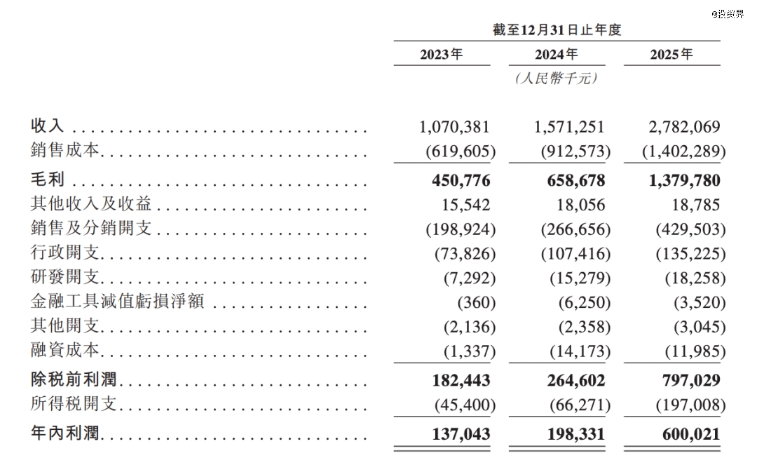 财务方面,阿麦斯的收入由2023年的人民币10.70亿元增加至2025年的人民币27.82亿元,复合年增长率为61.2%;净利润由2023年的人民币1.37亿元增加至2025年的人民币6亿元,净利润率由12.8%增加至21.6%。