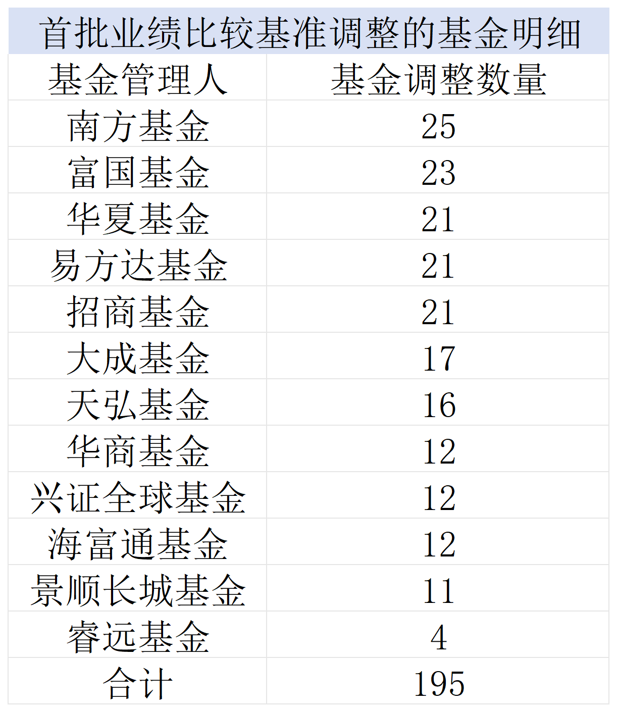 195只拟调整业绩比较基准的基金主要集中在头部公募公司和以主动权益为主的中型公募公司,包括易方达基金(21只)、华夏基金(21只)、富国基金(23只)、南方基金(25只)、招商基金(21只),还有大成基金(17只)、天弘基金(16只)、华商基金(12只)、兴证全球基金(12只),海富通基金(12只)等。