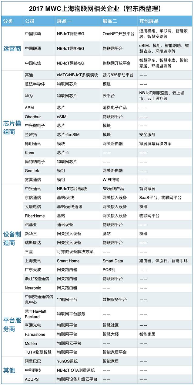 据智东西不完全统计,至少有40家公司围绕物联网展开布局,与物联网相关的展品多达数百个。这些企业涵盖了芯片模组商、网络运营商、设备制造商、平台服务商以及相关的测量评估商等产业链的各个环节,共同向外界传达一个声音——物联网的时代到来了。