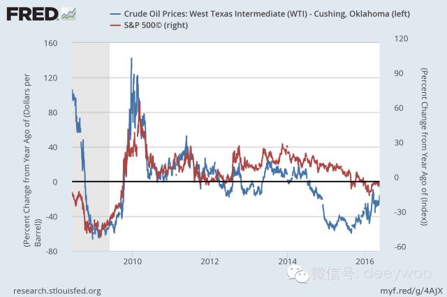 原油价格同比增速(蓝色,左轴) 美国标普500指数同比增速(红色,右轴) 数据来源:美联储