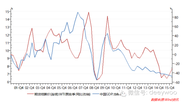 WTI原油价格同比增速(红色,右轴),中国GDP同比增速(蓝色,左轴) 数据来源:WIND资讯