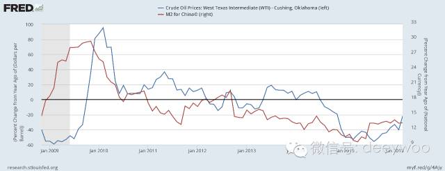 WTI原油价格同比增速(蓝色,左轴),中国M2同比增速(红色,右轴) 数据来源:美联储