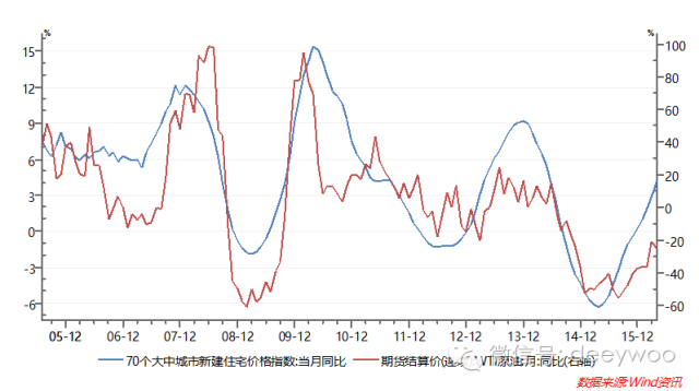WTI原油价格同比增速(红色,右轴),中国70个大中城市新建住宅价格指数同比增速(红色,右轴)数据来源:WIND资讯