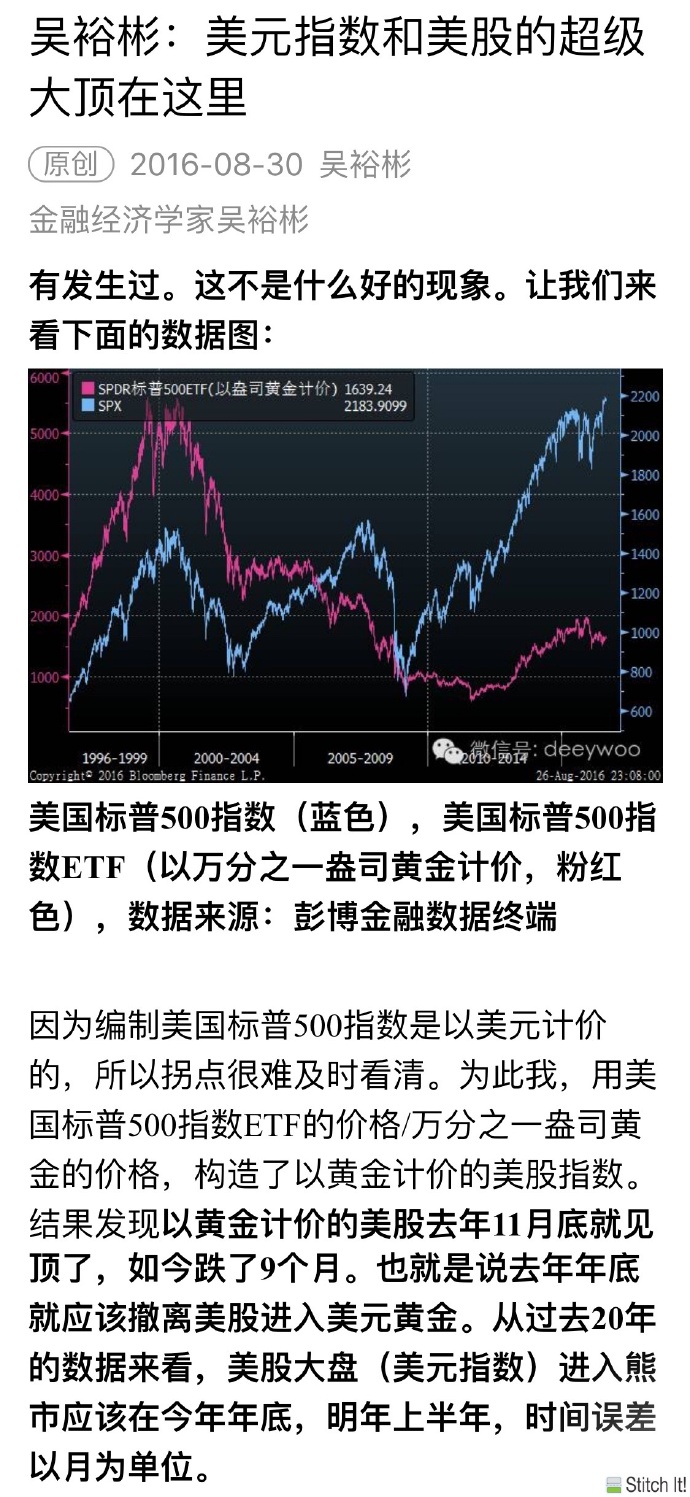 因此2017年9月份左右,美股也极有可能牛熊转换。这个预测结论我在2016年11月底在分答上告诉了一个来咨询的美股投资者,我还告诉了他其时SPDR S&P 500 ETF Trust离顶部还有多少上升空间。从那刻起到现在SPDR S&P 500 ETF Trust上涨了7.92%,充分的被我的预测范围覆盖。(2016年11月底的分答链接在此:http://fd.zaih.com/question/90000034224172660552)