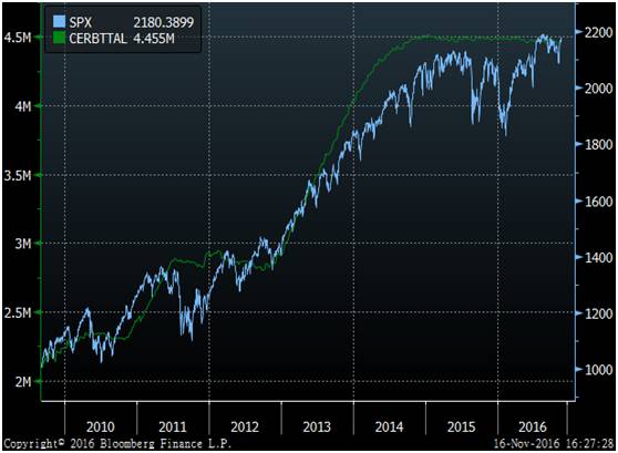美联储资产负债表规模(绿色)和S&P 500指数(蓝色),数据来源:彭博金融数据终端