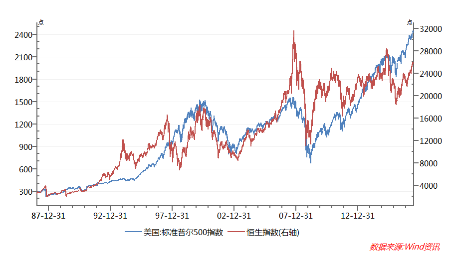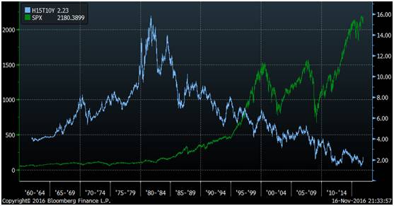 美国十年期国债收益率(蓝色),标普500指数(绿色),数据来源:彭博金融数据终端